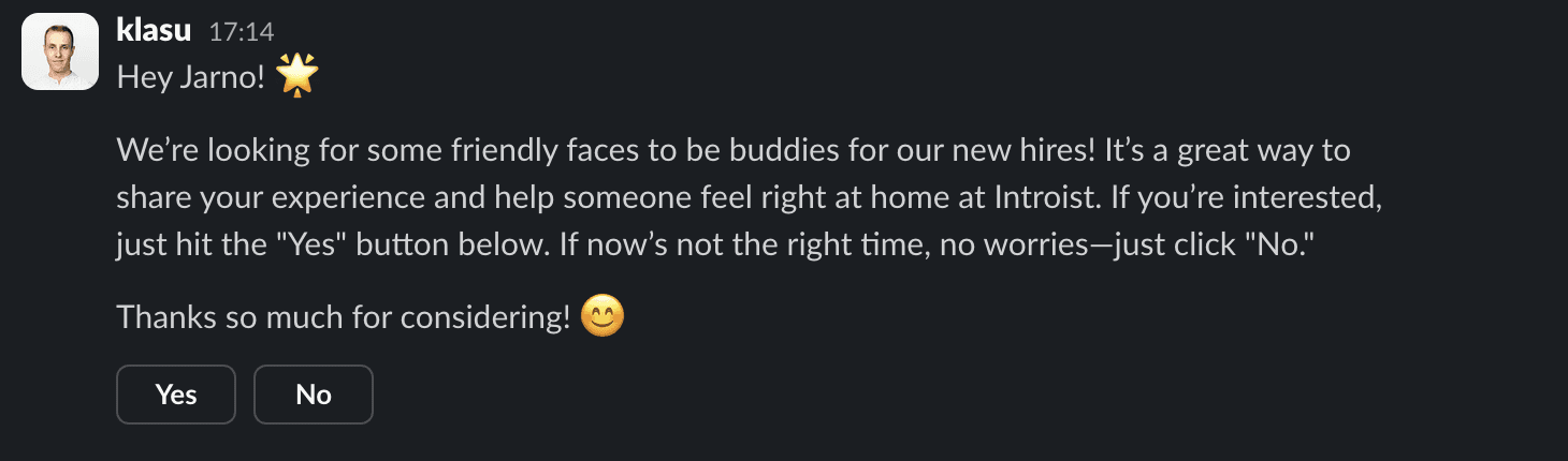 Buddy Volunteer Management: Introist makes it easy to maintain an updated list of buddy volunteers. You can set automated rules to regularly check in with potential buddies—via Slack, for example—asking if they're available to volunteer. Only eligible employees (like those with over a year of experience) are contacted, ensuring a well-prepared buddy pool.
