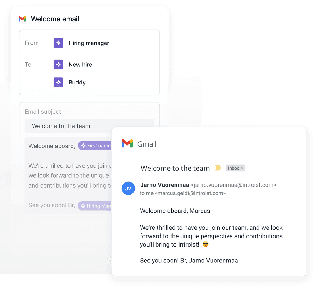 With Introist, you create tailored automated onboarding programs which also include preboarding, ensuring that new hires feel supported and prepared even before their official start date. New hires are welcomed with automated intro messages, scheduled training sessions, and provisioned accounts, allowing them to seamlessly integrate into the team and make valuable contributions right from the outset.