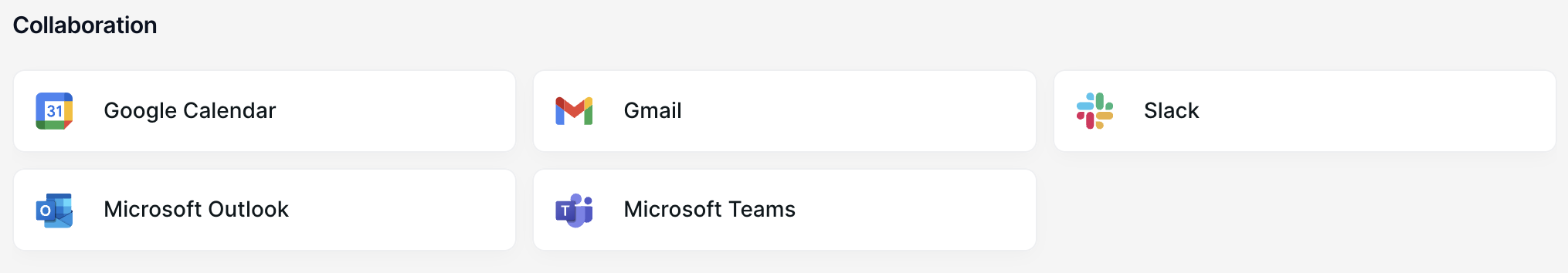 Communication and collaboration: Integration with messaging platforms (e.g., Slack, Microsoft Teams) and calendar tools (e.g. Google Calendar, Microsoft Outlook) is essential.