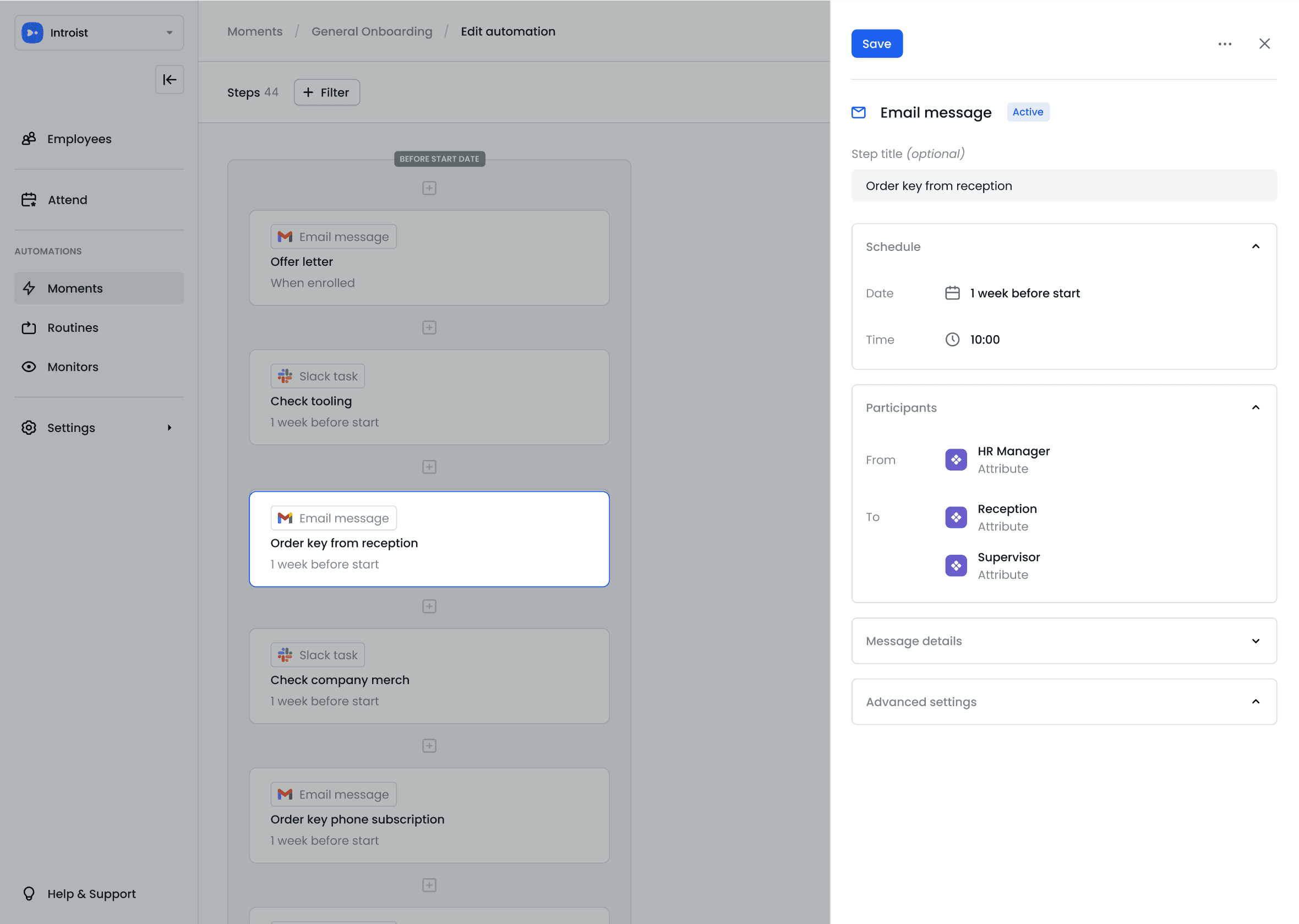 Introist seamlessly integrates with your HRIS, using the data therein to automate and personalize communications. When connected to an email client like Outlook or Gmail, Introist can send emails directly from a real person's email address. This level of integration means that the recipients of these automated emails would be hard-pressed to notice that they are not manually composed.