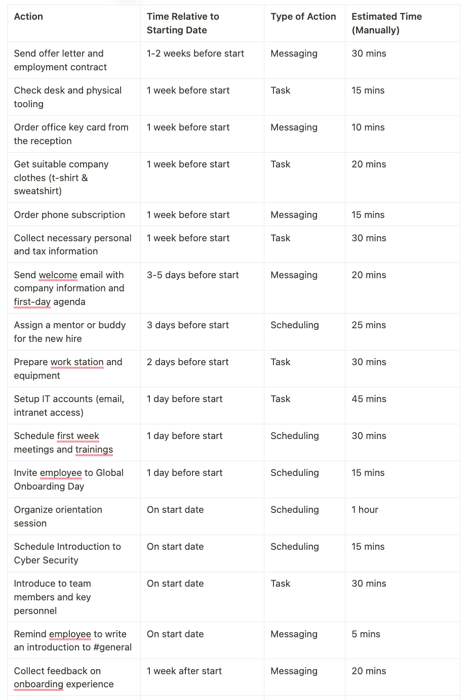 This basic onboarding program outline consists of 18 distinct actions, but it's worth noting that we’ve helped our customers automate onboarding programs with over 100 tasks. This is where automation can be particularly transformative. It enables the execution of a more detailed and granular set of actions without adding to the workload, thus enhancing the onboarding experience without increasing the HR team's burden.